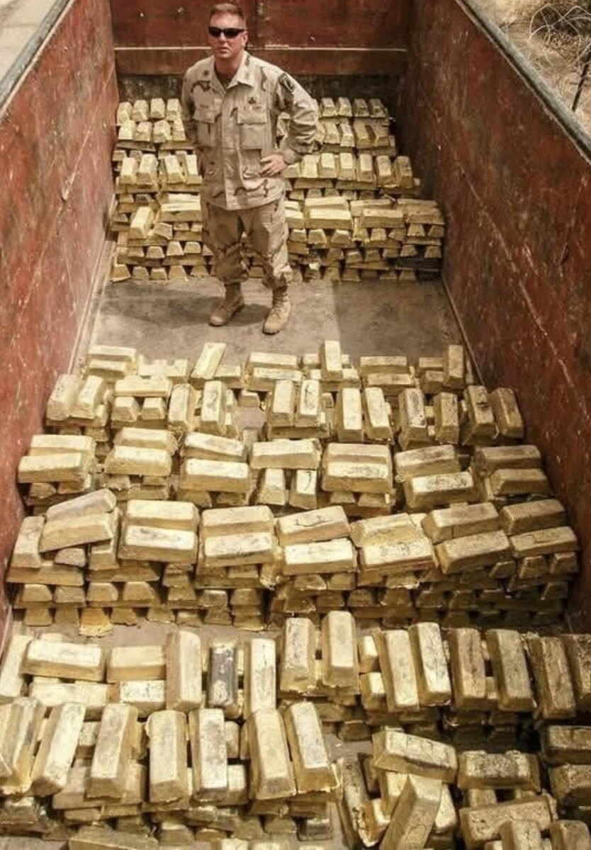 На этом снимке изображен американский солдат. Он стоит в грузовике, загруженном золотом, изъятым у Саддама Хусейна. Фотография сделана в Ираке, в 2003 году в начале Иракской войны.