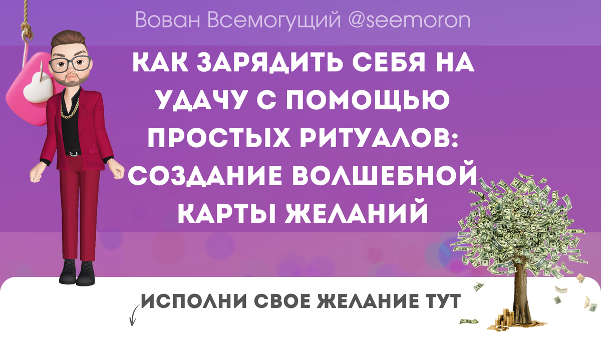 Привет, феюшки! Устали от серых будней, когда кажется, что удача обходит стороной? И вот вы уже думаете: "А может, я не умею загадывать желания? Или мне не суждено быть счастливой?" Ну что ж, самое время всё это забыть, как кошмарный сон, и зарядить себя на настоящую удачу! Сегодня расскажу вам, как создать волшебную карту желаний — это такой ритуал, который легко сделать, но который точно приведет к результату! Не буду вам рассказывать сказки, карту желаний — это не просто картинка с кучей вырезанных картинок из журналов (хотя и это тоже круто). Это мощный инструмент для концентрации энергии на том, что вы хотите получить. Говорю сразу, тут важен не только внешний вид карты, но и то, как вы её создаёте, с каким настроем. Карта желаний работает как волшебный магнит, притягивающий нужные события в вашу жизнь. Поверьте, мои феюшки, я не один раз видел, как с её помощью мечты превращаются в реальность! Прежде чем взять в руки ножницы и клей, нужно понять, чего вы хотите. Не просто абстра