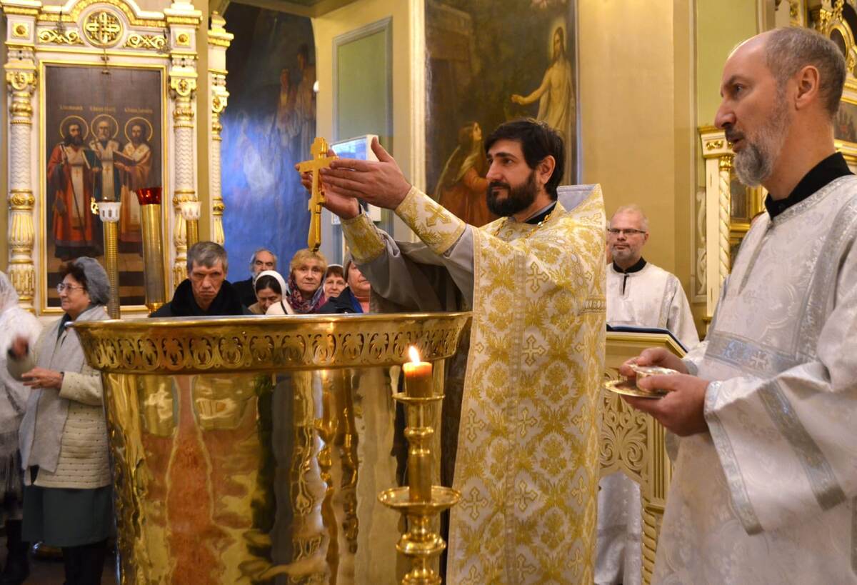 После Литургии была отслужена великая вечерня с чтением паремий. По отпусте вечерни в центре храма перед зажженной свечой священники и прихожане вместе с хором пропели тропарь и кондак праздника Богоявления.