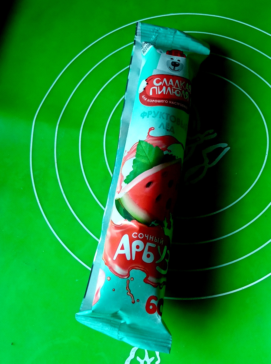 В первый раз взяла этот лед летом в жару. Удивительно, но он понравился детям. Они у нас привереды, мало что любят. Мороженое изготовлено с добавлением натурального сока, ГОСТ Р 55625-2013. ГДЕ КУПИТЬ. Магазин "Победа". ВЕС. 60 грамм. ЦЕНА. 14,70. ИЗГОТОВИТЕЛЬ. АО "Волга Айс". Состав Вода питьевая; сахар; мальтодекстрин; концентрированный яблочный сок: сок концентрированный яблочный, сироп глюкозно-фруктозный; комплексная пищевая добавка: стабилизаторы (карбоксиметилцеллюлоза, гуаровая камедь); регулятор кислотности лимонная кислота; пищевая добавка - краситель (вода, краситель кармины, регулятор кислотности гидроксид калия); ароматизатор "Арбуз". Я сначала даже пробовать не хотела, не люблю лед. Победило любопытство. Выглядит симпатично. Пахнет приятно и свежо. Даже слегка арбузом. Не приторно. Быстро тает. Поэтому детям даю только на тарелке. Распаковка: ВСЕ ФОТО и ВИДЕО АВТОРА МОЙ КАНАЛ на Ютубе https://www.youtube.com/channel/UCxR-cVRpbp0ZCwUI4Sro3aA ЕЩЕ СТАТЬИ и ВИДЕО о морож