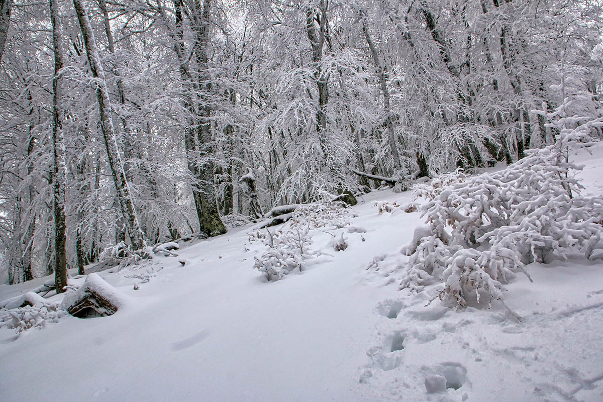 Продолжу рассказ о крымских зимах в горах (точнее о январе), начатый в публикации https://dzen.ru/a/Z4PAPlIKZSAPea-4 (2025-й год) и продолженный в https://dzen.ru/a/Z4kzCBxRxmc9tn2S (2018-й год). Судя по этим публикациям можно решить, что зима в горном Крыму "паинька" ласковая, нежная и солнечная. Но ... Впрочем смотрите сами - 2-е января 2019-го года. Скажу честно - состав участников открытия не помню от слова совсем. Тем более, что групповой фотографии не сохранилось. И вид сбоку и сзади не совсем позволяет идентифицировать участников "преступления". Естественно, кроме одного - Найка. Впрочем, как мне вспоминается со мною был мой коллега Виктор Бутрим с дочерьми Аней и Машей. День начинался благостно с голубого неба. Снега в январе 2019-го хватало. Особенно в горах. Тропа на верхнее плато была хорошо протоптана предшественниками и пробивать её в снегу не пришлось. Чем выше мы поднимались, тем менее голубым становилось небо. Хотя при выходе из леса все было более менее пристойно.