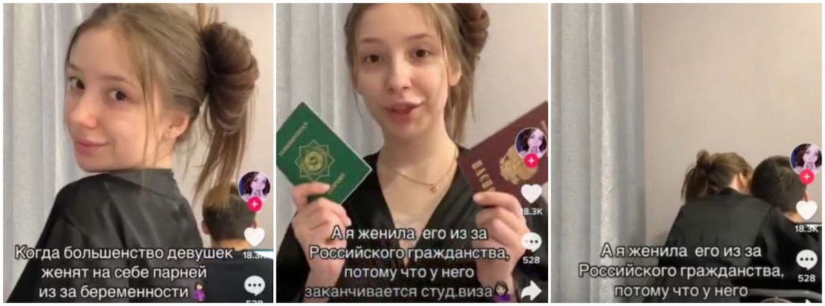 Настя из соцсетей похвалилась, что женила на себе «восточного принца». Девушке напомнили про Уголовный кодекс. В соцсетях новый тренд: рассказать, как вышла замуж. И вот какая-то Настя похвалилась, что вышла замуж за туркмена, потому что у него заканчивалась студенческая виза. Девушка собой гордится: у иностранца появился паспорт России, а у неё «муж». Ролик девушки из России по имени Настя стал вирусным из-за комментариев в соцсети. Девушка крутится под музыку, а внизу титры, что она гордится собой, потому что ей удалось женить на себе иностранца не беременностью, а потому что у него заканчивалась студенческая виза, а ему нужно было гражданство России. Настя собой довольна и целует «мужа», который ведёт себя так, будто манекен. На первый взгляд обычная история влюблённой женщины, которая пойдёт на всё ради «захвата» султана своего сердца, но есть, как говорится, нюанс. Уголовный. Настя считает, что обманула систему. Но скорее она заблуждается сама и ей ещё придётся расхлёбывать послед