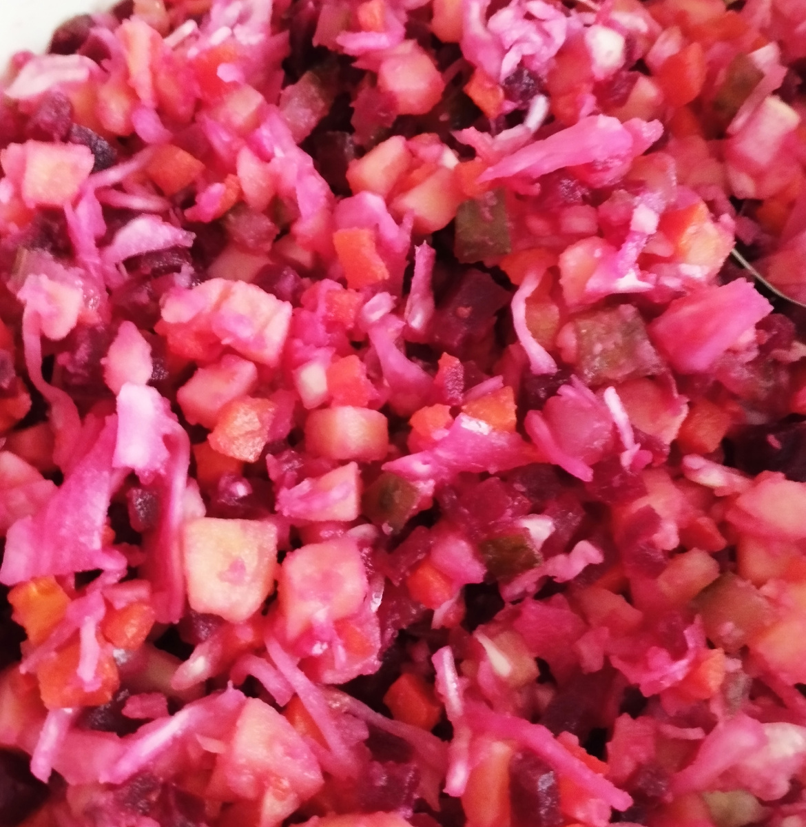 В нашем варианте он готовится из варёных овощей, солёных огурцов, квашеной капусты, БЕЗ БОБОВЫХ. Овощи обязательно хорошо промываем и варим "в мундире", так в них останется больше витаминов. Картофель и морковь варим полчаса, свёклу около полутора часов. Готовые овощи легко соскальзывают с лезвия ножа, если их проткнуть до середины. Картофель, морковь и свёклу остужаем и очищаем от кожуры. Овощи нарезаем одинаковыми маленькими кубиками. Лук очищаем от шелухи и измельчаем. Огурцы тоже мелко нарезаем и слегка отжимаем от рассола. Квашеную капусту, если она крупно нарезана, также нарезаем на более мелкие кусочки. Все ингредиенты хорошо перемешиваем в одной большой ёмкости. Перед подачей на стол добавляем растительное "пахучее" масло и наслаждаемся! Винегрет получается очень вкусным, как из советского прошлого, который подавали в каждой столовой! А если ещё и с селëдочкой, ммм... 😋 Всем мира, добра, красоты!