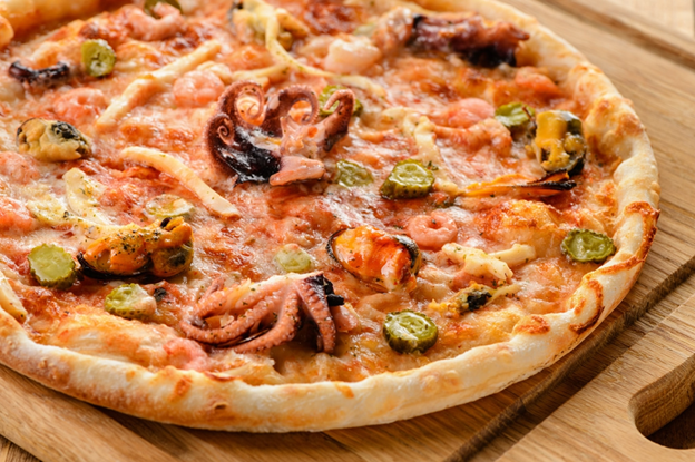 Этот рецепт поможет вам приготовить вкусную и ароматную пиццу с морепродуктами дома. Ингредиенты для теста: * 300 г муки * 1 ч.л. сухих дрожжей * 1 ч.л. сахара * 1/2 ч.л. соли * 1 ст.л. оливкового масла * 180 мл теплой воды Ингредиенты для начинки: * 200 г томатного соуса для пиццы * 200 г смеси морепродуктов (креветки, кальмары, мидии) – уже отваренных или замороженных * 150 г сыра моцарелла * 2 зубчика чеснока * 1/4 пучка свежей петрушки * Оливковое масло * Соль и перец по вкусу Приготовление: 1. Приготовление теста: * В большой миске смешайте муку, дрожжи, сахар и соль. * Добавьте оливковое масло и теплую воду. * Замесите тесто до гладкости и эластичности. * Накройте миску пленкой и оставьте тесто подниматься в теплом месте на 1 час. 2. Подготовка начинки: * Если используете замороженные морепродукты, разморозьте их и обсушите. * Мелко нарежьте чеснок и петрушку. * Натрите моцареллу на крупной терке. 3. Сборка пиццы: * Разогрейте духовку до 220°C. * Раскатайте тесто в круглый