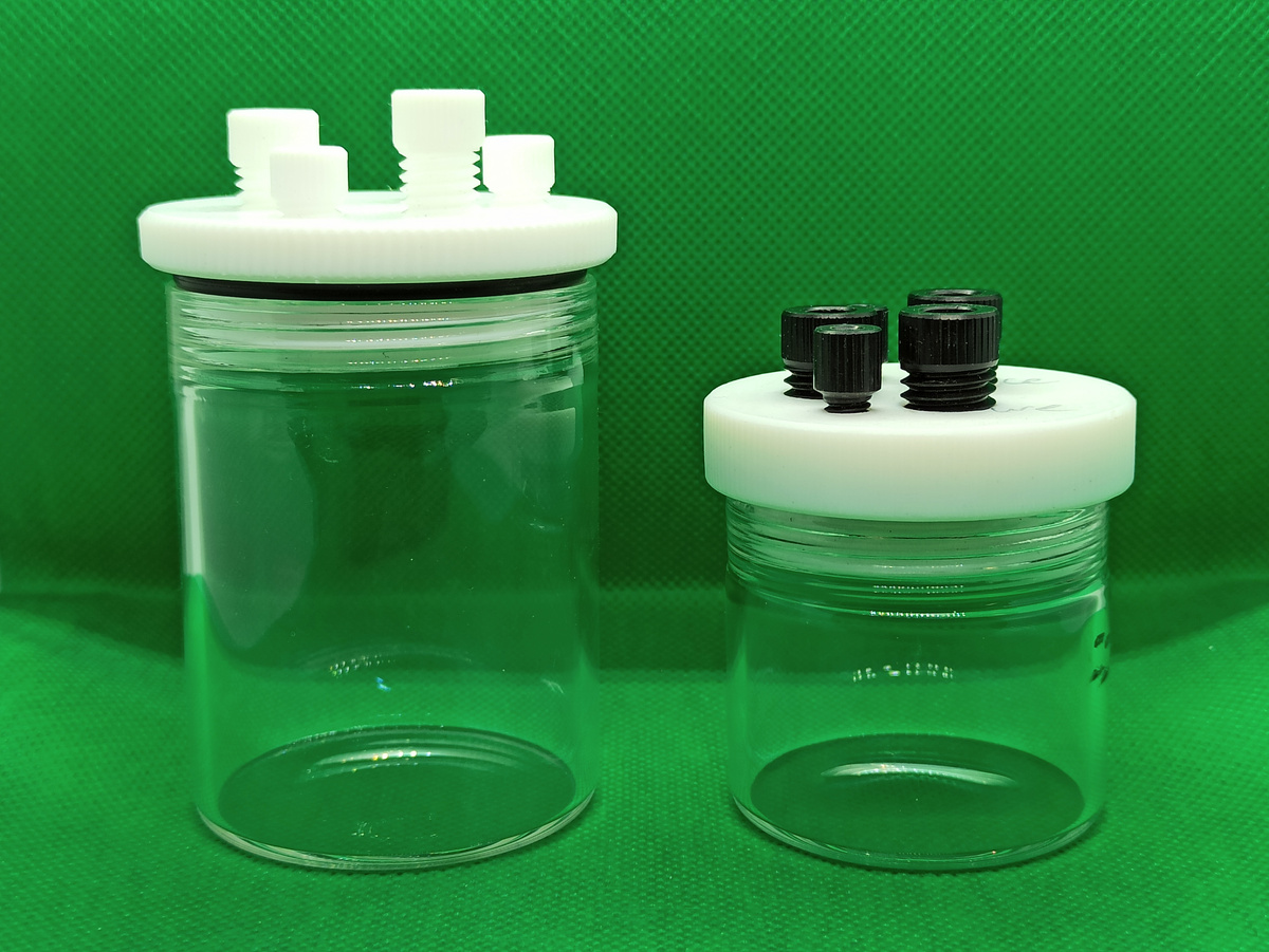 Это самая простая и поэтому распространенная конструкция сосуда для электрохимических процессов. В таких ячейках делают синтезы и проводят измерения свойств. Номинальные объемы реакторов такого типа не ограничены, но в аналитике они не превышают 150-200 мл. Сама ячейка – это стакан. Иногда это буквально химический стакан, иногда реактор с резьбой и герметичной крышкой, являющейся держателем для электродов. На фотографии, вы можете видеть такую ячейку на 100 мл (слева) и на 50 мл (справа). В крышке имеется пять отверстий. Три из них предназначены для фиксации электродов – рабочего, вспомогательного и сравнения, а оставшиеся два (небольшие) – для трубок, которыми осуществляется продувка электролита инертным газом или водородом. При экспериментах по двухэлектродной схеме (электролиз, электросинтез) неиспользуемые отверстия герметизируют специальными вставками, входящими в комплект. Диаметры отверстий подходят для электродов диаметром 6-8 мм и трубок 3-5 мм. Перемешивание в таких ячейках