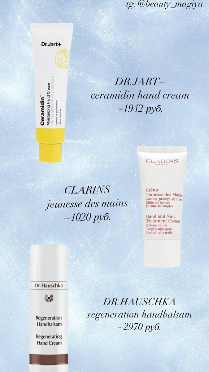 уход за руками - это важная часть бьюти-рутины, и выбор правильного крема может существенно повлиять на состояние кожи🎀 зимой особенно важно увлажнять кожу рук, поэтому сделала для вас актуальную подборочку👇 ⚪️ DR.JART+ ceramidin hand cream идеальный выбор для тех, кто ищет интенсивное увлажнение✨ его формула содержит керамиды, которые восстанавливают защитный барьер кожи и предотвращают потерю влаги💓 крем обладает очень легкой текстурой, быстро впитывается, не оставляя неприятное ощущение жирной пленки на руках🌟 ⚪️ CLARINS jeunesse des mains формула крема обогащена экстрактами шелковицы и маслом кунжута, которые увлажняют и питают кожу, а также защищают ее от воздействия внешней среды🤍 этот крем не только делает руки мягкими и ухоженными, но и помогает уменьшить видимость пигментных пятен, что особенно важно для поддержания молодости кожи🌟 нежный аромат добавляет ощущение роскоши😍 ⚪️ DR.HAUSCHKA regeneration handbalsam снова скажу, что обожаю их натуральные составы❤️ крем содер