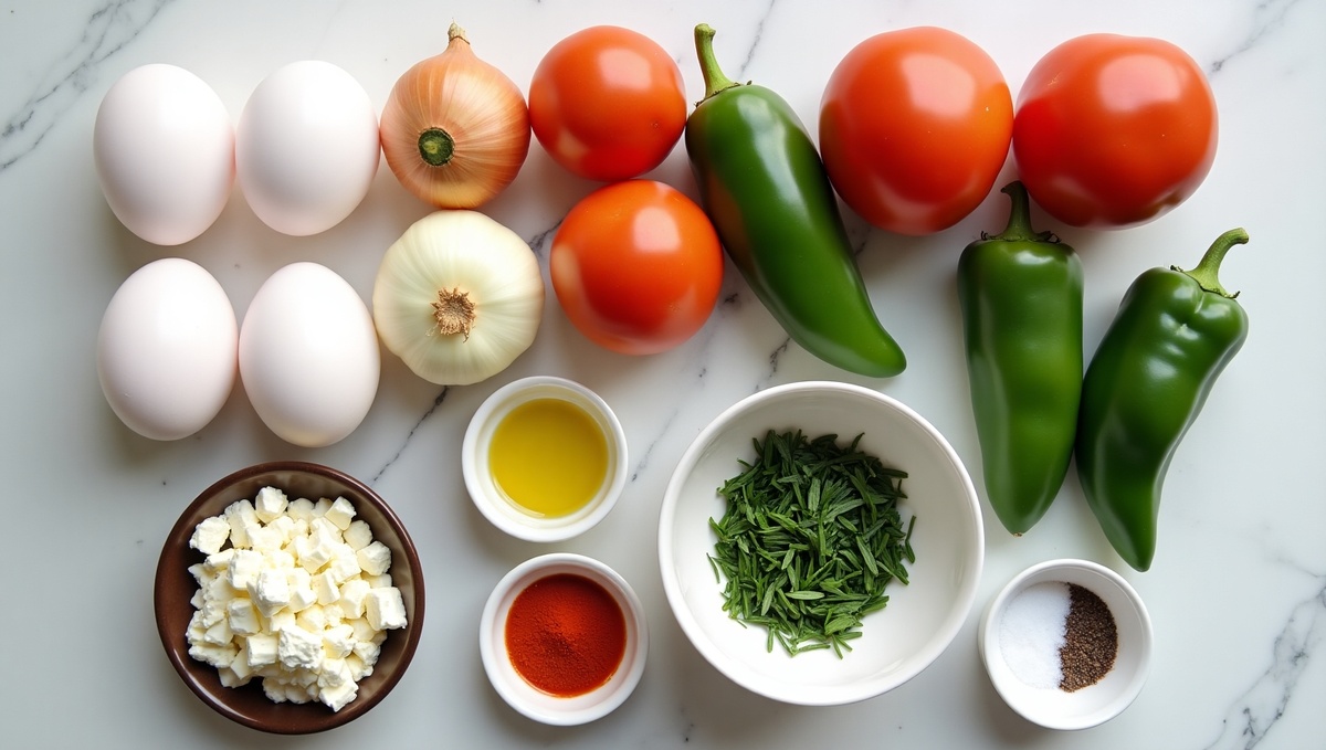 Менемен — это блюдо, простое в своей основе, которое включает яйца, помидоры, зеленые перцы, и различные специи, такие как черный перец и паприка. Часто его украшают луком и чесноком для добавления аромата, а любители острых блюд могут добавить красный перец. Главная особенность менемен в его гибкости: в зависимости от региона или личных предпочтений, в блюдо могут добавлять сыр, колбасные изделия или другие овощи, такие как баклажаны.