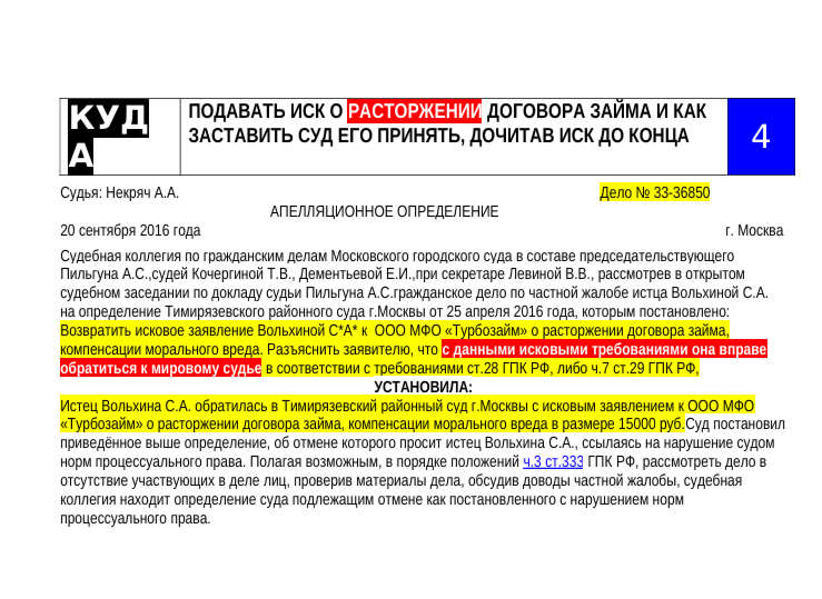 Куда подавать иск о расторжении договора займа и как заставить суд его принять, дочитав иск до конца Судья: Некряч А.А. Дело № 33-36850 АПЕЛЛЯЦИОННОЕ ОПРЕДЕЛЕНИЕ 20 сентября 2016 года г. Москва Судебная коллегия по гражданским делам Московского городского суда в составе председательствующего Пильгуна А.С.,судей Кочергиной Т.В., Дементьевой Е.И.,при секретаре Левиной В.В., рассмотрев в открытом судебном заседании по докладу судьи Пильгуна А.С.гражданское дело по частной жалобе истца Вольхиной С.А. на определение Тимирязевского районного суда г.Москвы от 25 апреля 2016 года, которым постановлено: Возвратить исковое заявление Вольхиной С*А* к ООО МФО «Турбозайм» о расторжении договора займа, компенсации морального вреда. Разъясни