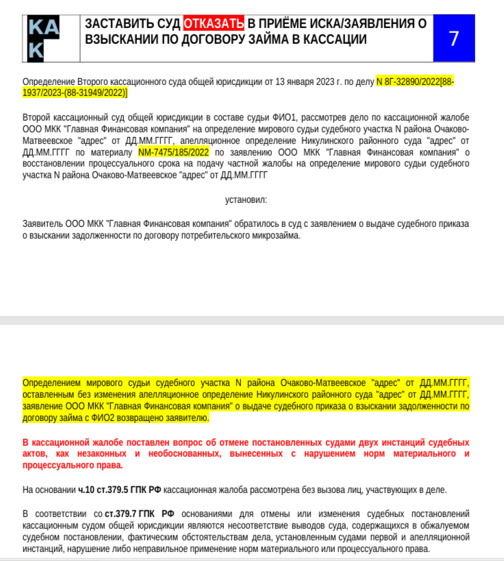КАК ЗАСТАВИТЬ СУД ОТКАЗАТЬ В ПРИЁМЕ ИСКА/ЗАЯВЛЕНИЯ О ВЗЫСКАНИИ ПО ДОГОВОРУ ЗАЙМА В КАССАЦИИ