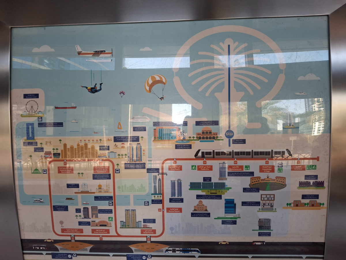 На карте как раз остров Пальма и нарисован справа. Едем на трамвае от остановки 01 до остановки 09 (до монорельса). Трамвайная остановка закрытая. В автомате надо купить карточку. Карточка стоит 25 дирхам (6 стоит сама карточка + 19 дирхам на счет). Карточка одна на трамвай и метро. Трамвай стоит 3 дирхама, метро - в зависимости от зоны. Чтобы ехать на метро, на карточке должно быть 7,5 дирхам независимо от зоны. Это максимальная цена на метро. Пересадка трамвай - метро бесплатная.