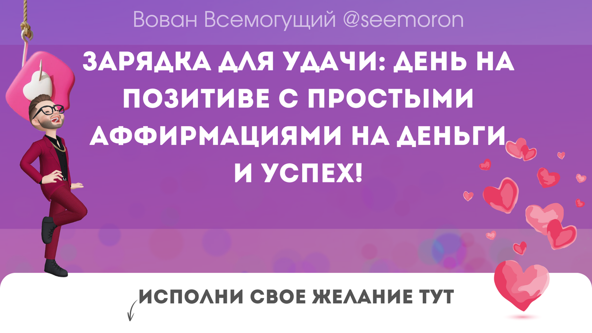 Феюшки и волшебницы, сегодня у нас особая тренировка. Нет, штанги поднимать не будем, но прокачаем свою удачу, денежный поток и позитивное мышление! Представьте, что каждая аффирмация — это ваш личный заряд энергии, который запускает магнит для успеха. Ну что, готовы стать немного счастливее и богаче? Открываем глаза, потягиваемся и говорим себе: "Сегодня — мой день! Удача меня обожает, а деньги сами летят в мои руки!" Звучит как сказка? А вот и нет! Это магия вашей энергии. Маринка, помните её? Она по утрам вместо ворчания на будильник шепчет аффирмации. "Деньги приходят ко мне легко и с удовольствием!" И что вы думаете? Через месяц её начальник неожиданно предложил премию! В течение дня ловим момент, когда хочется закипеть, например, из-за пробки, очереди или слишком длинного совещания. Вместо раздражения — вдох-выдох и волшебная фраза: "Я притягиваю успех во всех делах! Мир любит меня, а деньги всегда рядом." Эту штуку Людка из соседнего офиса взяла на вооружение. Теперь она вместо