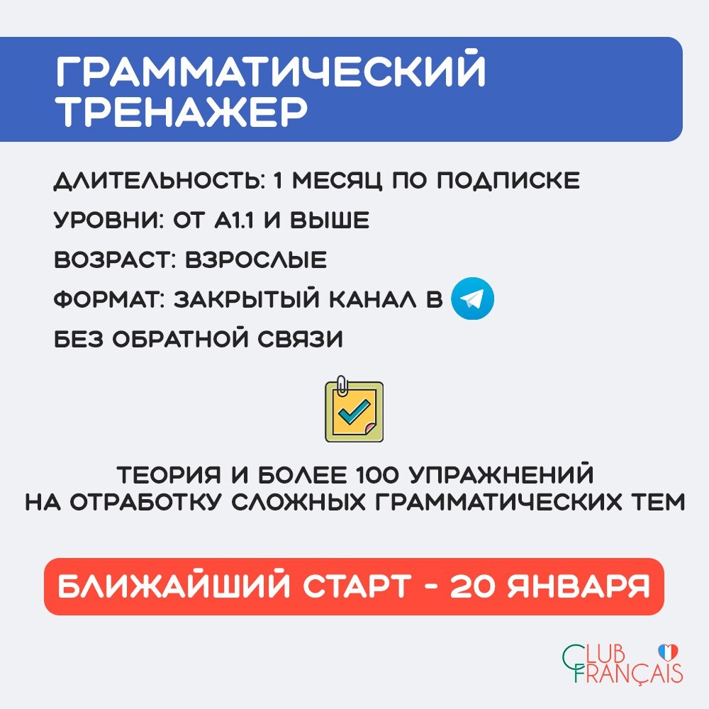 Все материалы к нему заряжены ✅ Уже завтра мы начинаем работать над одной из самых сложных тем во французском языке — артикли! 🎉 Вы еще можете присоединиться: 🇫🇷https://francaisclub.ru/grammaire/ Какой результат можно получить после работы с тренажером и как он устроен, читайте в карточках☝️