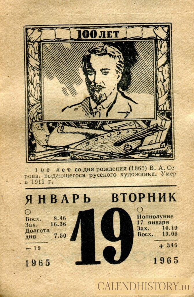 Итак, сегодня 19-го января и у нас на календаре 1965-й год. Перед нами листок советского календаря для женщин. На календаре у нас вторник - 19 января 1965-го года. 100 лет со дня рождения (1865) В. А. Серова, выдающегося русского художника. Умер в 1911 г. *** Оборотную сторону листка этого календаря можно посмотреть у нас по ссылке на сайте. Другие листки советских календарей смотрите у нас на сайте - CALENDHISTORY.ru ПОСМОТРИТЕ ЕЩЁ ЛИСТКИ ОТРЫВНЫХ КАЛЕНДАРЕЙ: