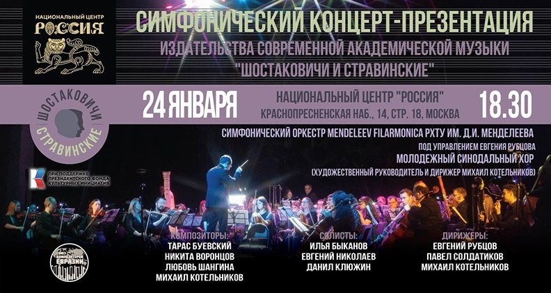 Возрастное ограничение: 6+ 24 января 2025 года в Национальном центре «Россия» состоится симфонический концерт-презентация, организованный издательством «Шостаковичи и Стравинские» в честь Дня студента. В рамках мероприятия будут представлены эксклюзивные произведения современных композиторов, которые не оставят равнодушными даже самых опытных любителей академической музыки. Для гостей будет исполнено несколько ярких произведений современной академической музыки: Эти произведения стали результатом вдохновенной работы современных авторов и обещают стать важной вехой в развитии русской академической музыки. Пр