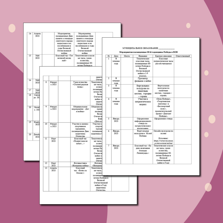Название: «План мероприятий, посвящённых 80-й годовщине Победы в Великой Отечественной войне». Целевая аудитория: школьники и студенты СПО. Описание: Мы предлагаем вам готовый план мероприятий. В программе предусмотрены разнообразные активности, которые будут интересны как школьникам, так и студентам СПО. В плане представлены следующие мероприятия: Все мероприятия направлены на сохранение исторической памяти о подвиге нашего народа в годы Великой Отечественной войны. Они помогут воспитать у молодёжи чувство патриотизма и уважения к истории своей страны. План разработан с учётом возрастных особенностей участников и требований образовательных программ. Он может быть адаптирован под конкретные условия вашей школы или колледжа. #80летПобеды #ВеликаяОтечественнаявойна #патриотическоевоспитание #школьные_мероприятия #мероприятия_СПО #память #история #подвиг #ВОВ Ссылка для скачивания: