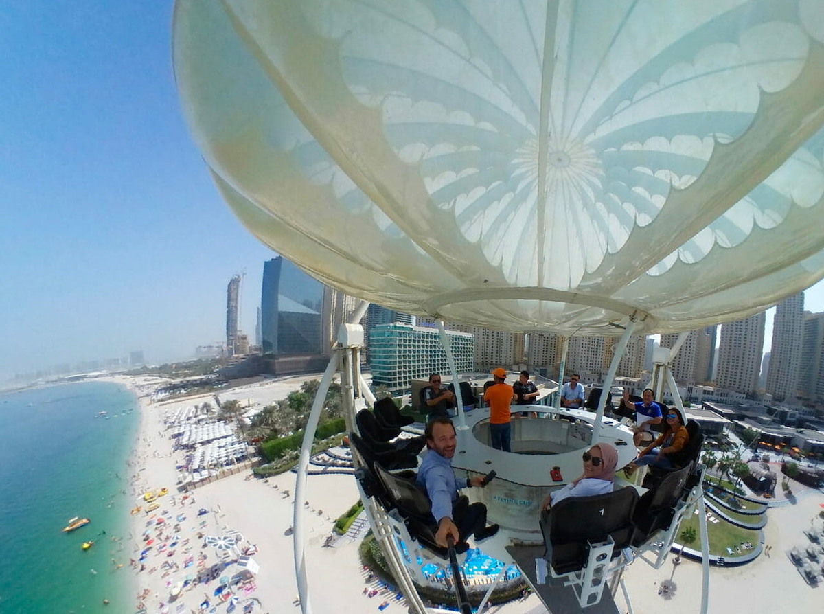 Посетители садятся за столики, пристегиваются ремнями безопасности, и конструкция медленно поднимается вверх. На высоте она фиксируется, позволяя гостям наслаждаться видами, напитками и закусками в расслабленной обстановке.