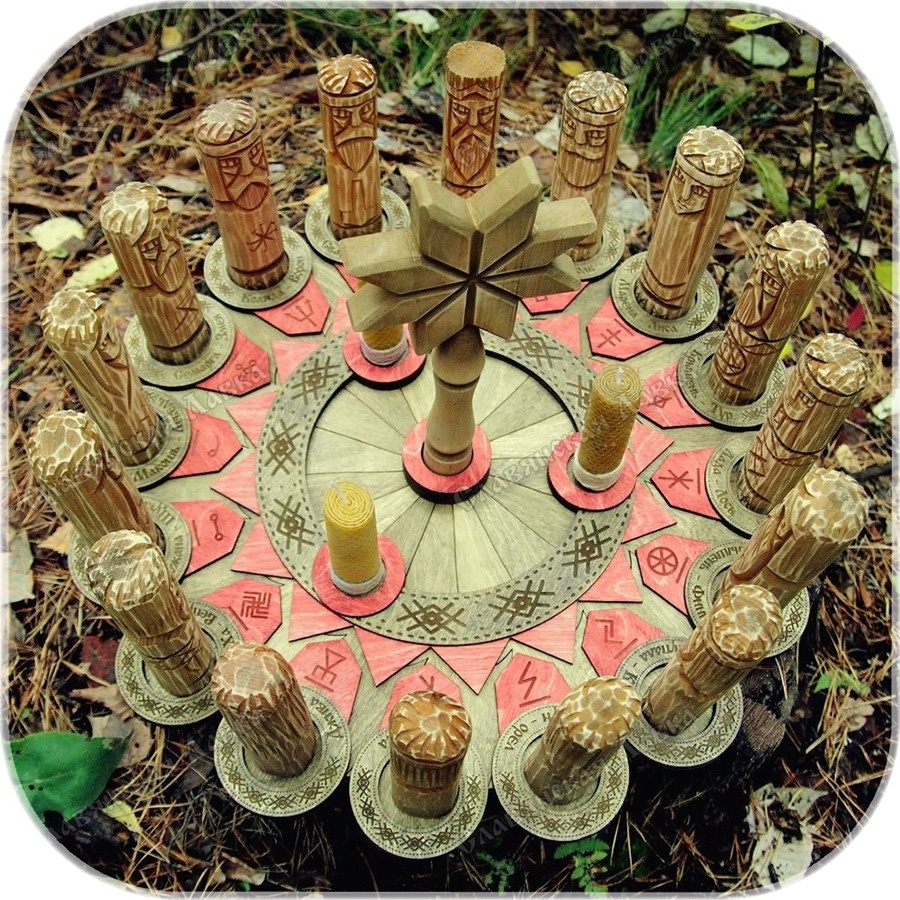 Сварожий круг полный комплект Благодарность мастеру: 11790 - Заявки можно скидывать на WhatsApp по номеру телефона 8-913-367-41 Алтарь у славян задолго до христианства предназначался для проведения множества ритуалов. Вот только как он выглядел - спорят до сих пор. Проливают свет на это мегалитические сооружения, которые встречаются по всему миру, в том числе - и на территории современной России. Где камни (истуканы, что фактически означает - кумиры) образуют круг, символизирующий астрономические циклы, а в центре данного круга располагается непосредственно Алтарь (Алатырь-камень - центр мироздания, Вселенной). Следуя этой логике, мы создали аналог мегалитического сооружения - домашний алтарь, основанный на Чертогах Сварожьего круга, и, разумеется, предназначенный для богов-покровителей данных чертогов. Как нам кажется, это полноценная и действующая масштабная модель большого капища на 16 богов (Род, Велес, Марена, Вышень, Крышень, Лада, Купала, Перун, Тарх, Джива, Рамхат, Рожана, Мако