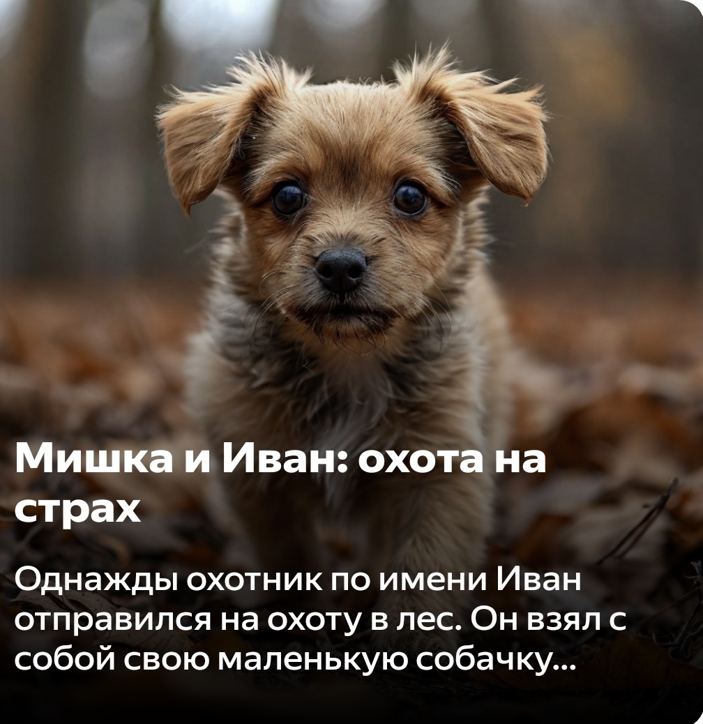 Однажды охотник по имени Иван отправился на охоту в лес. Он взял с собой свою маленькую собачку Мишку. Они долго шли по лесу, и Иван заметил, что Мишка очень боится разных животных. Но охотник не обращал на это внимания и продолжая идти вперёд.
