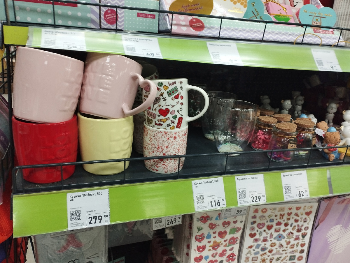 Несмотря на то, что до 14 февраля еще практически месяц, магазин уже предлагает задуматься о подарках и небольших презентах. Как и всегда, в таких лимитированных коллекциях появляются кружки, только в этот раз я бы отметила лишь те, что по 116 рублей. Они выглядят интересно, словно вся поверхность в значках, а вот те, что рядом, и стоят дорого, и смотрятся уже более просто (279 рублей за 500 мл). Конечно же, не обошлось и без популярных термостаканов, их стоимость 229 рублей.