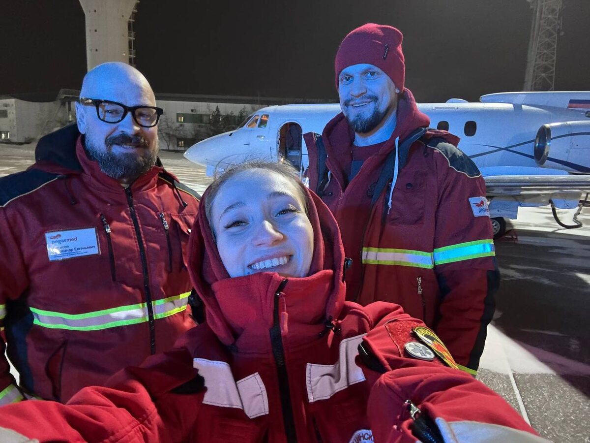 Улеглись относительно комфортно. С выключением света, веки опустились сами. Я моргнул, и снова свет. Пора выходить, посадка прошла успешно! Мы достали свои смартфоны и быстро сфотографировались с коллегами, встречающими нас на скорой прямо возле самолета. Упуская описание формальностей паспортного контроля, прибывшего к нам прямо в самолет - мы загрузили оборудование, кислород, и уже едем в больницу.