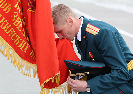 Процедура выпуска проста и волнительна, где прощание со знаменем училища и само награждение офицерским знаком и дипломом.