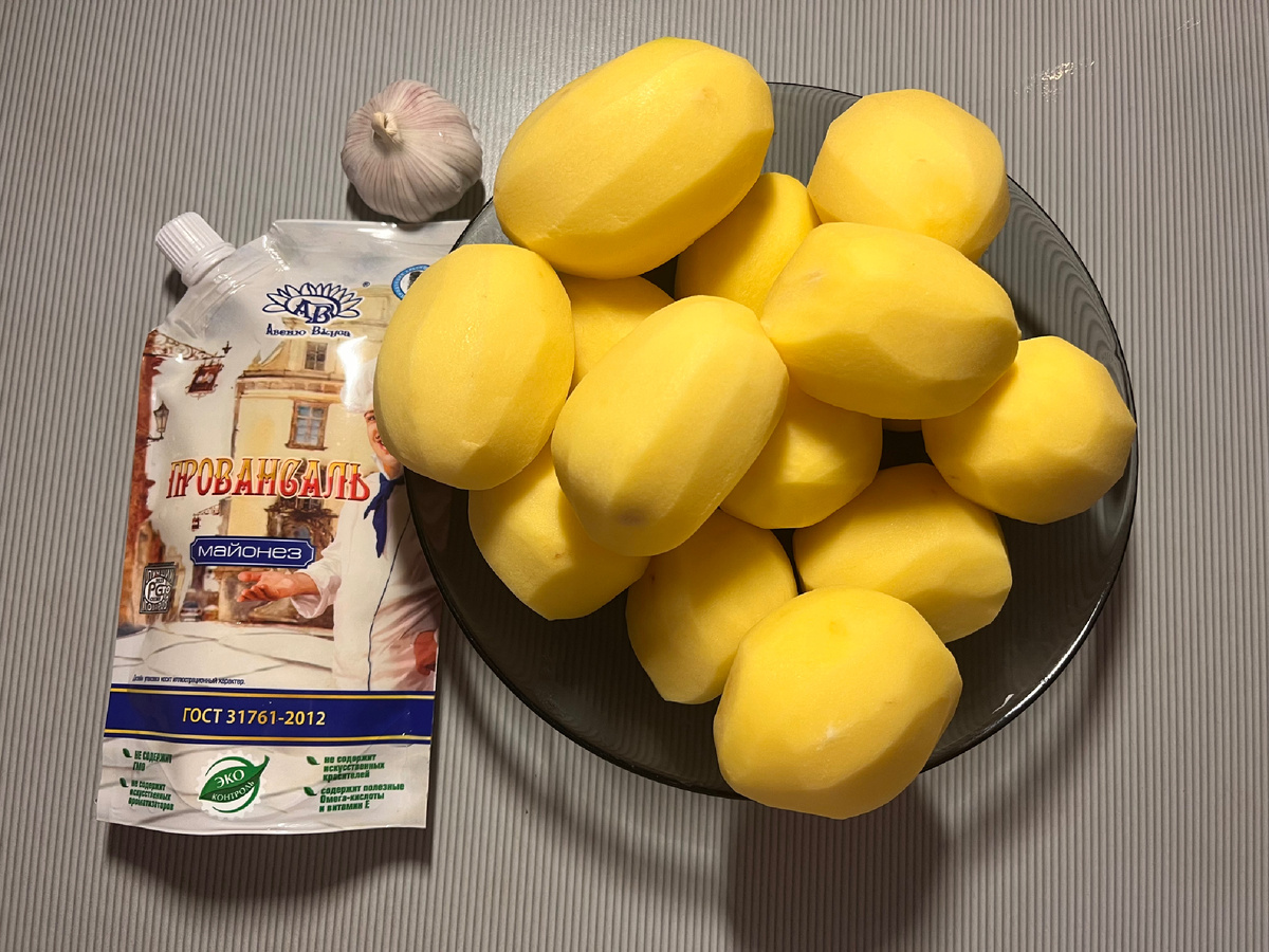 - Вытащите картофель и сделайте майонезную смесь ( натрите чеснок на мелкой терке, 3-4 зубчика чеснока и пару ложек воды)