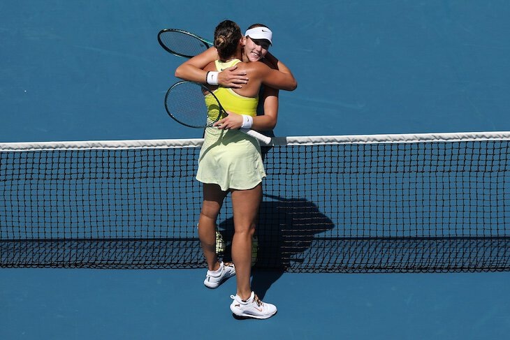 Пока что главная победа в карьере Мирры Андреевой – четвертьфинал «Ролан Гаррос» против Арины Соболенко. В том матче молодая россиянка отыгралась с 0:1 по сетам и закрыла лучшую теннисистку на «Больших шлемах» в трех партиях. Мирра тогда впервые вышла в полуфинал ТБШ – в 17 лет. Правда, есть одно но. Соболенко в том матче очень плохо себя чувствовала – у нее были проблемы с желудком из-за не до конца прожаренного мяса, съеденного в день перед матчем. По ходу игры даже был момент, когда она уже выдвинулась к сетке, чтобы сняться – но в последний момент передумала. Конечно, достижение Мирры это не умаляет. Но это важный контекст – потому что с Соболенко у нее уже пять матчей, и та победа остается единственной. Причем во всех остальных встречах Андреева ни разу не смогла взять больше пяти геймов. В четвертом круге Australian Open-2025 она потерпела самое разгромное поражение – 1:6, 2:6. Матч длился всего 62 минуты. *** Мы привыкли говорить, что Мирре тяжело с Соболенко, потому что их стил