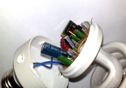 Внутри энергосберегалки есть электронная схема - балласт. Балласт - это высоковольтный преобразователь, он предназначен для повышения сетевых 220 вольт до 1000 вольт (нужное напряжение, для питания лампы). На выходе балласта опасное напряжение, потому во время опытов следует соблюдать предельную осторожность.