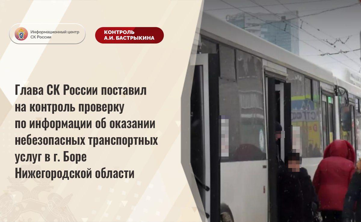 Глава СК России поставил на контроль проверку по информации об оказании небезопасных транспортных услуг в г. Боре Нижегородской области В СМИ сообщается, что 17 января текущего года в городе Боре Нижегородской области кондуктор автобуса высадила из транспортного средства школьницу в связи с тем, что последняя не смогла оплатить проезд. В СУ СК России по Нижегородской области по данному факту организована процессуальная проверка. Председатель Следственного комитета Российской Федерации Александр Иванович Бастрыкин поставил ход процессуальной проверки на контроль в центральном аппарате ведомства и поручил руководителю СУ СК России по Нижегородской области Айрату Саетовичу Ахметшину представить доклад о ее промежуточных результатах и принятом по итогам решении. #СледственныйКомитет #СКРоссии #СКР #ИЦСКР #Информационныйцентр #АлександрБастрыкин #ПредседательСКР #КонтрольПредседателяСКР #КомментарийКонтроль #НижегородскаяОбласть