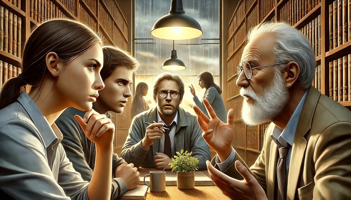 Дождливый вечер. В аудитории философского факультета студенты и преподаватель собрались за круглым столом для еженедельного дискуссионного клуба. Тема обсуждения — древнегреческое понятие «πείρατα» из книги Онианса "На коленях богов". На столе лежат разложенные копии текстов Гомера и Платона, а за окном мягкий свет фонарей и звук дождя создают атмосферу размышлений.