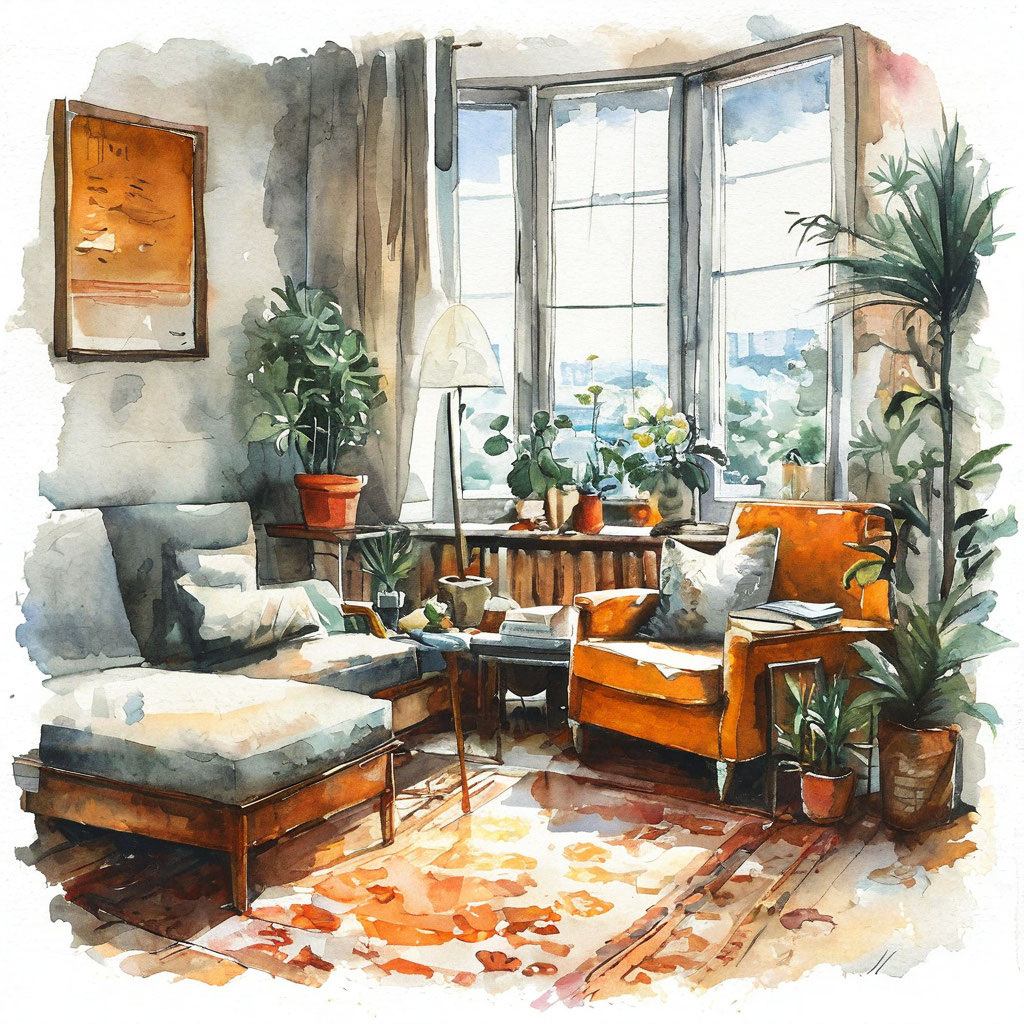 Чтобы интерьер выглядел целостным, остановитесь на 2–3 основных оттенках и 1–2 дополнительных. Тёплые тона (бежевый, терракотовый, песочный) отлично сочетаются с природной зеленью, а нейтральные оттенки (серый, белый) позволяют акцентировать внимание на ярких деталях.