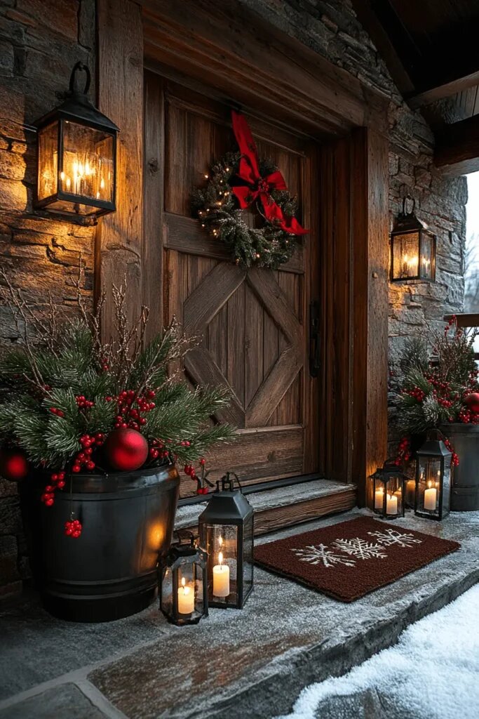 - Рождественский венок. Венок из еловых веток с шишками, лентами и ягодами станет классическим украшением двери. Дополните его гирляндой для мягкой подсветки.
