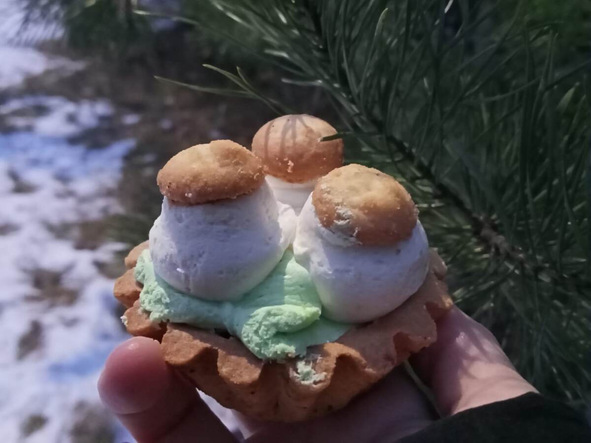 Купила свои любимые (сто лет не бывавшие рядом со мной) снежные корзиночки и пошла в лес. Нашла там скамью, присела. И расчищала ложколопатой снежные сугробы пирожного.