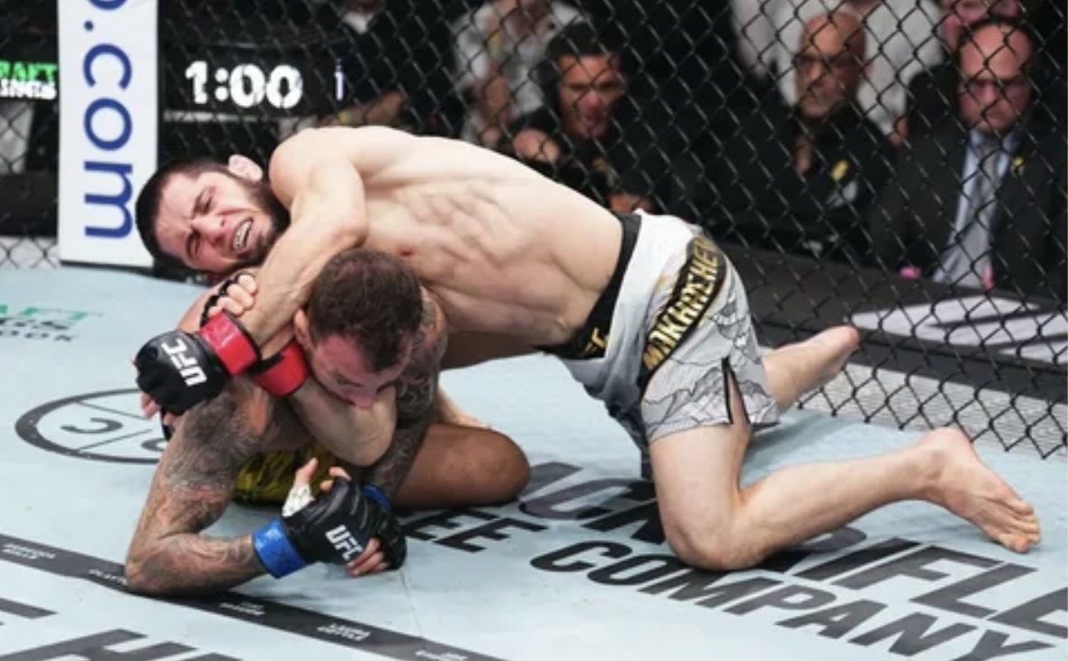 Махачев победил в первом раунде, применив удушающий приём, и защитил титул чемпиона UFC в лёгком весе.