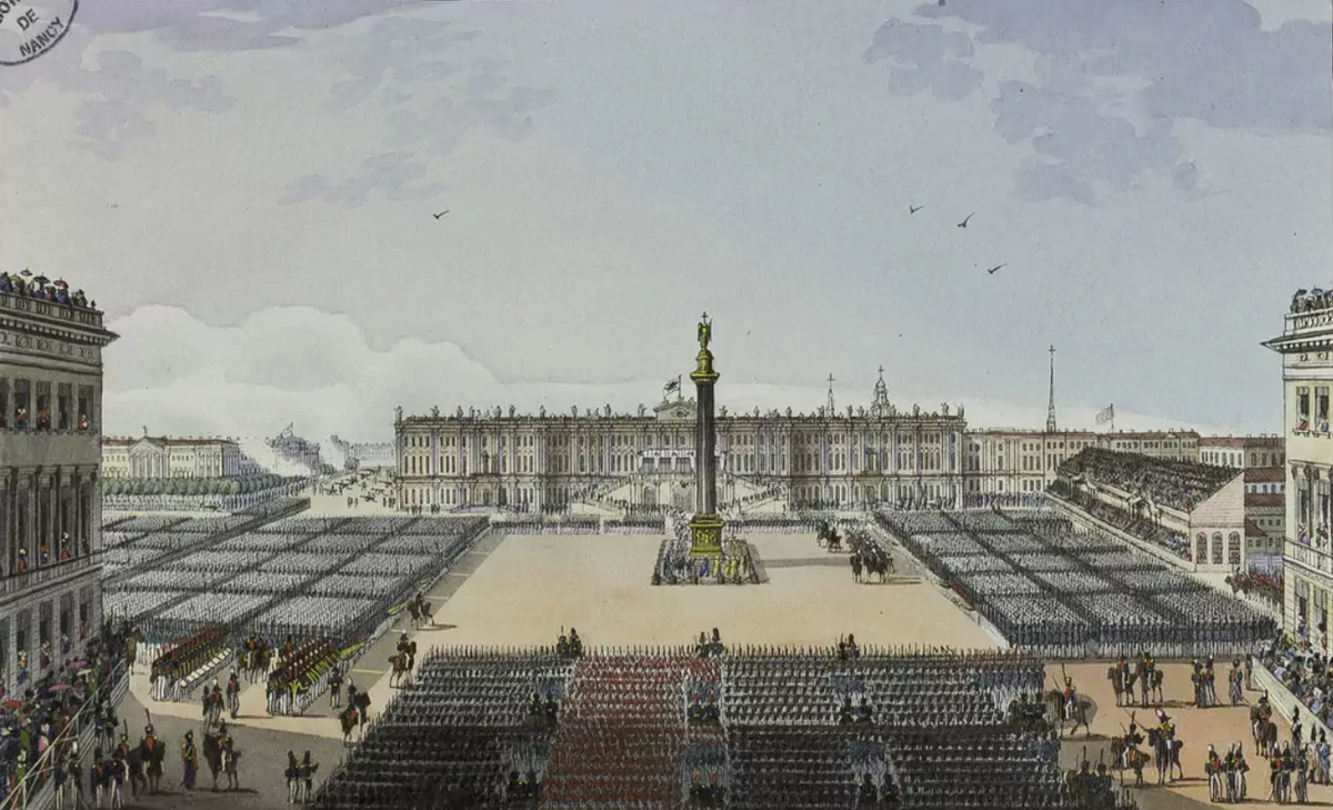 Санкт-Петербург, 12 сентября. - Вчера состоялось торжественное открытие Александровской колонны. Наши газеты оставили за собой описание этой грандиозной церемонии, но уже вчера одна из них опубликовала следующую выдержку из письма в провинцию: «30-е августа (11 сентября) не за горами, и вот уже несколько дней наша столица готовится достойно встретить праздник Александра Благословенного. Вокруг великолепной колонны уже красуется решётка с золотыми столбами, и только её основание ещё ожидает торжественного открытия. На дворце наших регентов, над его главным алтарём, приветливо выглядит украшенный сине-белым полосатым фоном и императорским орлом балкон, с которого, после завершения церковной службы, 30 августа начнется шествие. Слева от дворца - упираясь в Экзерциргауз и его флигель - друг над другом и до самой крыши возвышаются несколько рядов ступеней, которые предназначены для размещения зрителей, обезпеченных билетами. Здания напротив Зимнего дворца - Главного штаба и министерств иностранных дел и финансов, - отдельные арки которых имеют длину 160 шагов, также снабжены пятью рядами ступеней для удобства зрителей, которые были размещены под окнами первого этажа. Эти ступени окружает галерея, которая продолжается за пределами вышеупомянутых арок. Аналогичные возвышения построены также перед зданием Экономического общества и дома Веберша.