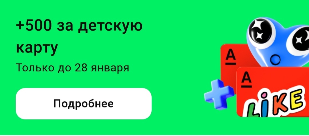 Альфа выкатил акцию, до 28 января, тот кто закажет Детскую карту с кешбэком до 5% и бесплатным обслуживанием даже если у него уже есть Альфа-карта получит бонус 500 руб. Для этого нужно сделать покупку на любую сумму по Детской карте. По личному опыту деньги зачислят сразу как покупка пройдет обработку (2-3 дня). Дополнение ништяки: есть детское приложение в котором есть игра в ней можно получать баллы и даже рубли. Со своим колесом кешбэка. В остальном примерно такие же возможности что и у других банков. Ребёнку от 6 до14 лет Свидетельство о рождении Свой номер телефона Классная карта, но нам почему то принесли Детскую карту без детской тематики, может пластик не поспевает за акцией, не знаю. В целом ребенок доволен, а это главное. У меня уже была Альфа-карта, но я получил за Детскую бонус, у кого нет заказываем сразу две карты. Больше полезного в Телеге