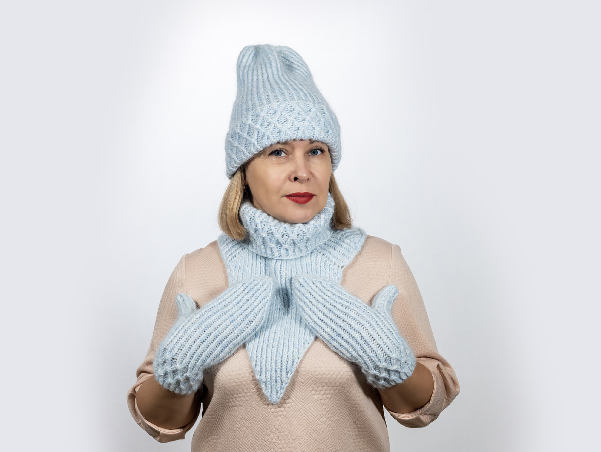 Для вязания Комплекта понадобится: - 1 моток пряжи Alize Angora Gold цвет 55, в 100 гр. 550 м., состав 20% шерсть, 80% акрил; - 1 моток пряжи ALIZE 3 Season цвет 55, в 100 гр. 500 м., состав 25% мохер, 24% шерсть, 51% акрил; - 2 мотка пряжи Alize Kid Royal, цвет 183, в 50 гр. 500 м., состав 62% кид мохер 38% полиамид. Всего у меня получается: 1 нить Alize Angora Gold, 1 нить ALIZE 3 Season и 2 нити Alize Kid Royal, что получается 300 гр пряжи и длина 500 м. или 165 метров в 100 гр. Вы можете использовать любую пряжу аналогичной толщины. На манишку у меня ушло 95 гр пряжи. Также понадобятся спицы № 4 круговые 40, крючок №3, трикотажная игла. Расчет я делала исходя из того, что в 1 см 2 петли, а в высоту в 1 см 2.1 ряда. Подробный мастер класс о вязании манишки можно посмотреть по ссылке: https://dzen.ru/video/watch/678d20ce473b02200b6c3064 Набираем 81 петлю, 80 для вязания и 1 для замыкания вязания в круг. Вешаем маркер начала ряда. Резинку вяжем 1 лицевая скрещенная *1 изнаночная. При