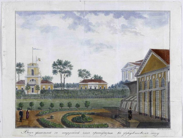 «Вид флигелей с террасой от оранжереи во фруктовом саду в селе Грузино.»