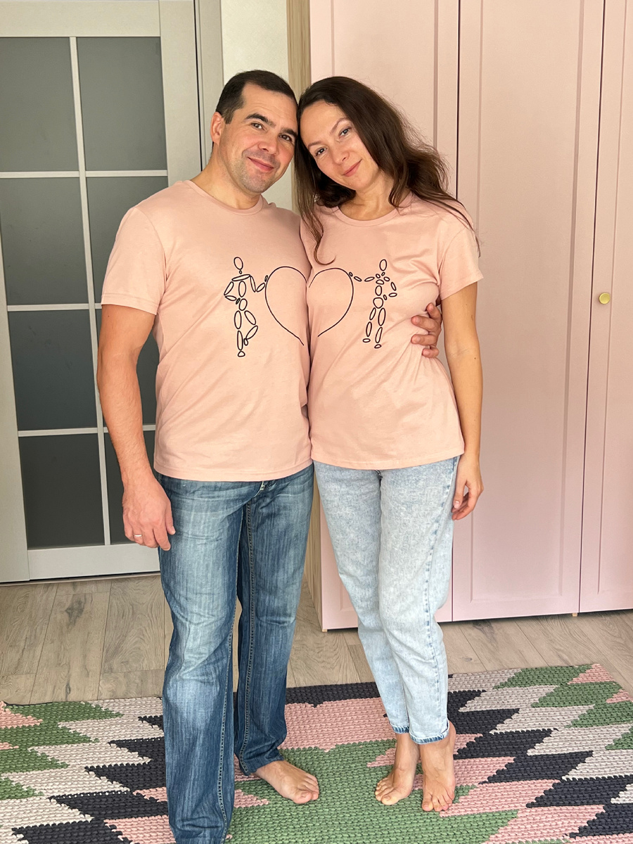 Не успели отгреметь одни праздники, как уже не за горами новые. День влюбленных, 23 февраля и так далее по списку)) Сегодня хочу показать вам интересную идею оригинальных подарков для любого праздника, в дизайне которых вы можете поучаствовать сами. Либо выбрать понравившийся вариант на сайте Vsemayki. Здесь можно найти товары с классными принтами на любой вкус. К 14 февраля нам с мужем я заказала парные футболки. Парные футболки с необычными принтами – оригинальный способ в очередной раз признаться в любви своей половинке и показать единство союза двух любящих сердец. Я выбрала принт «человек придерживает половинку сердца». Если мы встанем вместе, как на фото, то получится одно сердце на двоих. Такой у нас получился семейный образ. Футболки очень порадовали качеством: хлопковые, приятные к телу, и печать отличная. Цветов самих футболок множество, мы остановились на приятном пыльно-розовом цвете. Идея, конечно, была моя, а муж поддержал и остался доволен выбором. Мне уже не терпитс