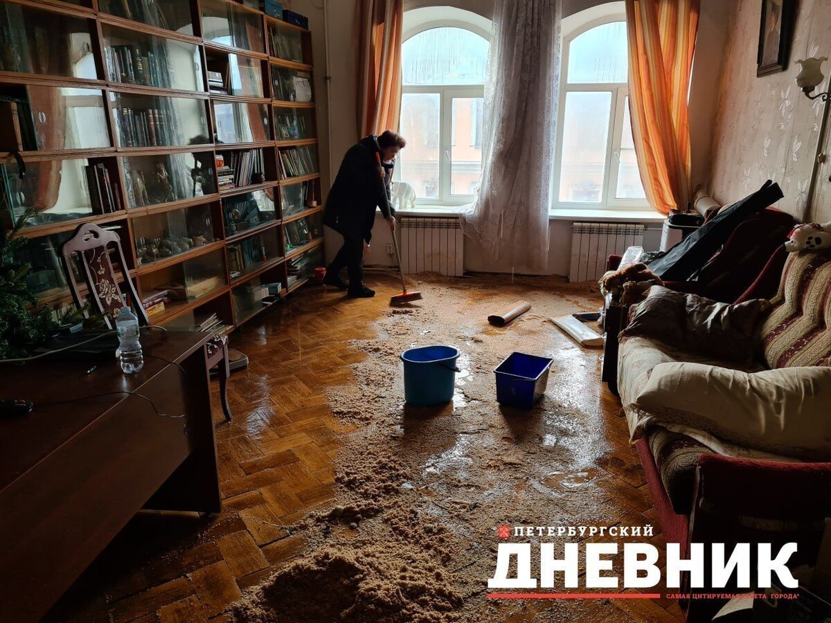 Фотограф «Петербургского дневника» запечатлел, как жители и МЧС продолжают устранять последствия пожара и тушения. На потолке следы от проливки, на полу песчаная смесь.