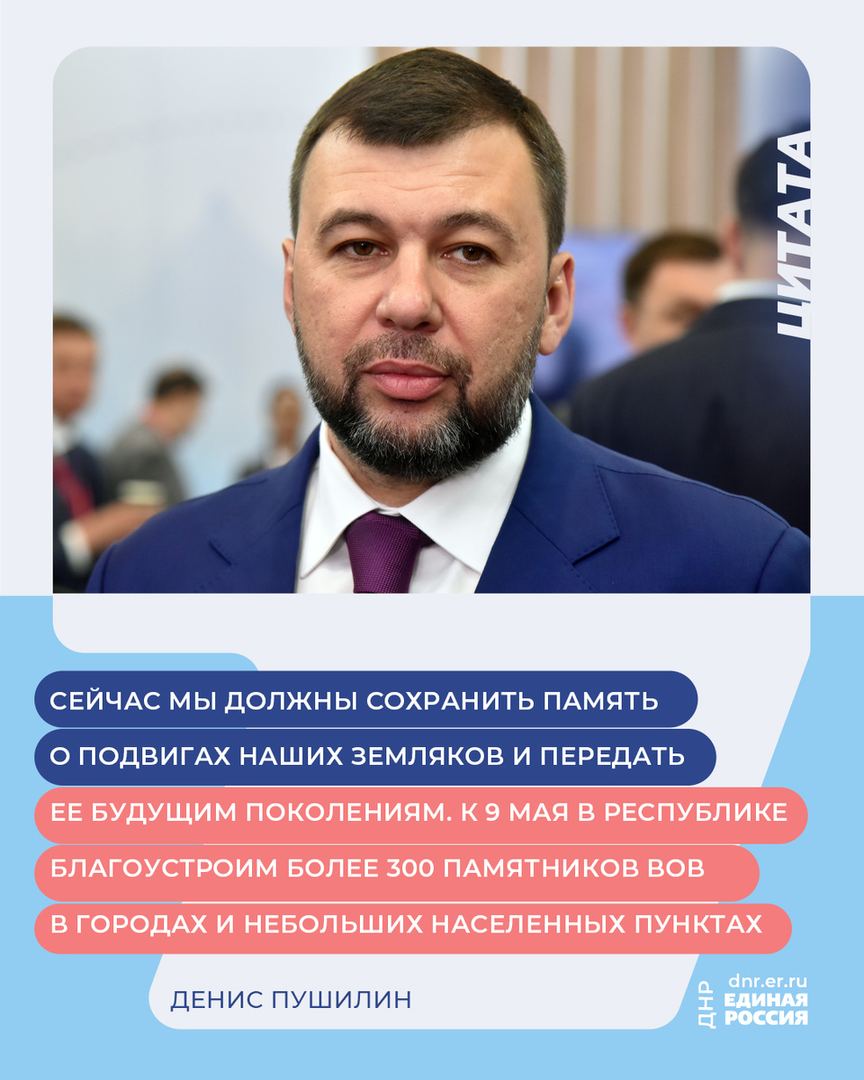 ⭐️ В планах до 9 мая благоустроить более 300 памятников и мест воинской славы. Глава ДНР, Секретарь Донецкого регионального отделения партии «Единая Россия» Денис Пушилин рассказал, что будет сформирован региональный оргкомитет, посвященный празднованию 80-летия Победы. Уже составлена программа восстановления мемориальных памятных объектов. Вместе с главами муниципалитетов прорабатывается вопрос присвоения званий почетного гражданина городов и населенных пунктов не только участникам Великой Отечественной войны и героям СВО, но и защитникам Донбасса, которые с оружием в руках отстаивали право на нашу свободу с 2014 года. ▶️ Читать полностью