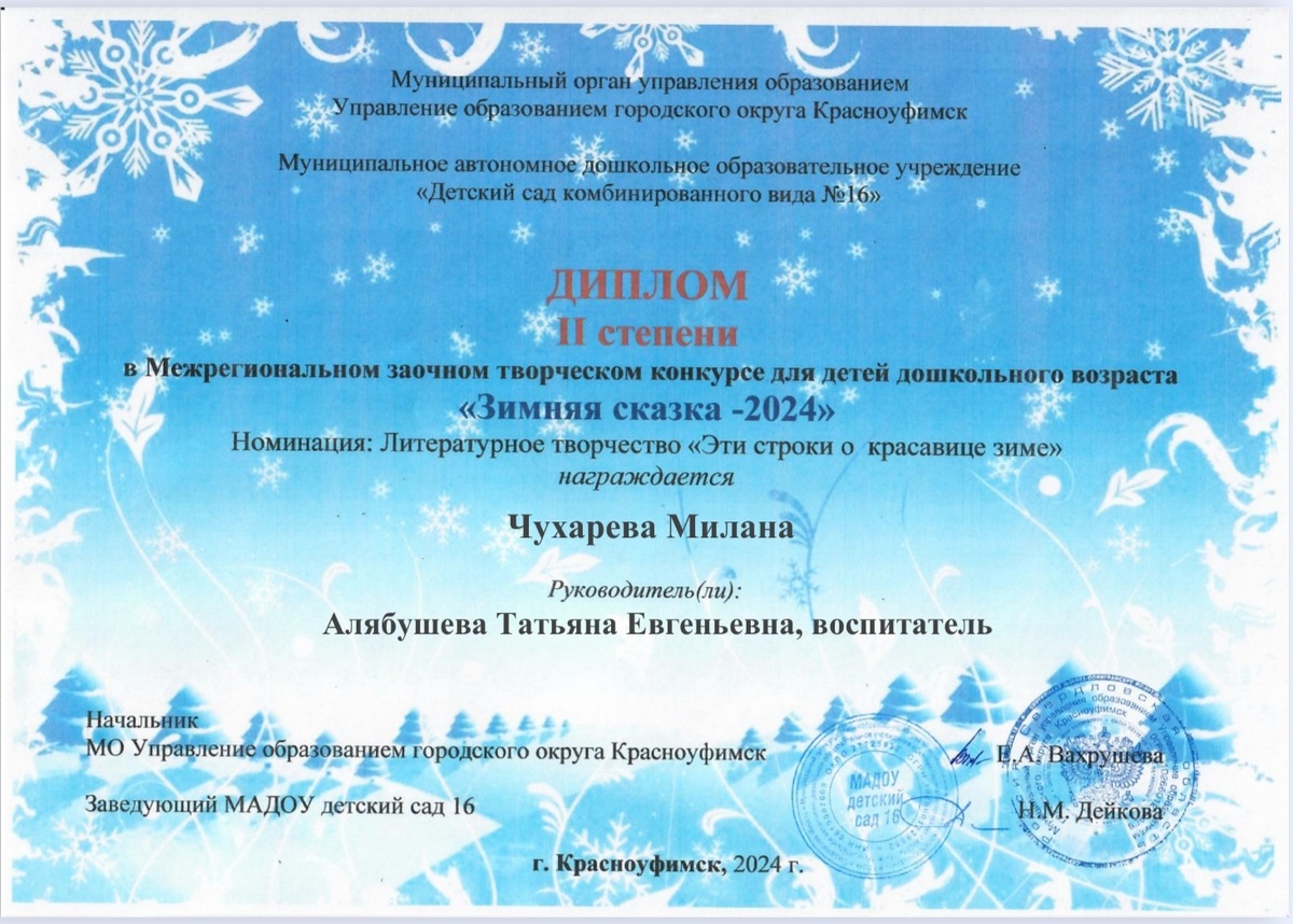 В декабре 2024 года дети средней группы приняли участие в Межрегиональном заочном творческом конкурсе "Зимняя сказка!", в котором заняли 1 и 2 место.