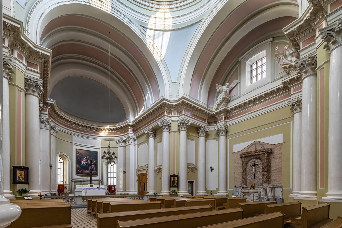 Интерьер церкви был украшен живописными работами Д. Валериани, а скульптурные композиции создал А. Альбани. Надпись над входом в костёл гласит: «Domus mea domus orationis / [M]ath: XXI cap[ut] / Anno Domini MDCCLXXXII. Die». Это означает: «Храм мой храм молитвы наречется. Мф. 21. Лето Господне 1782».