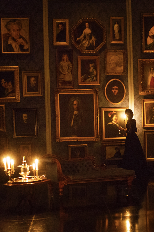 Элеонора зажгла канделябр с несколькими свечами и поняла, что находится в картинной галерее. По крайней мере такой она была раньше. Сейчас же множество полотен просто стояли на полу. Кое-какие накрыли простынями, кое-какие даже завернули в бумагу. Но большинство картин подпирали стены, набросанные в несколько слоев. Чуточку прогулявшись, Элеонора поняла, что на полотнах лишь портреты.