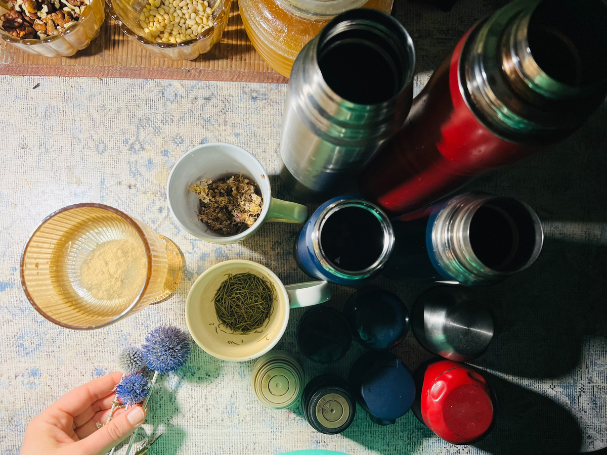 Наливаю полный чайник воды, ставлю его на печку греться. А пока он распевается, затевает свои тоненькие песни, я мою термосы, готовлю кружки и насыпаю в них всякие вкусняхи.