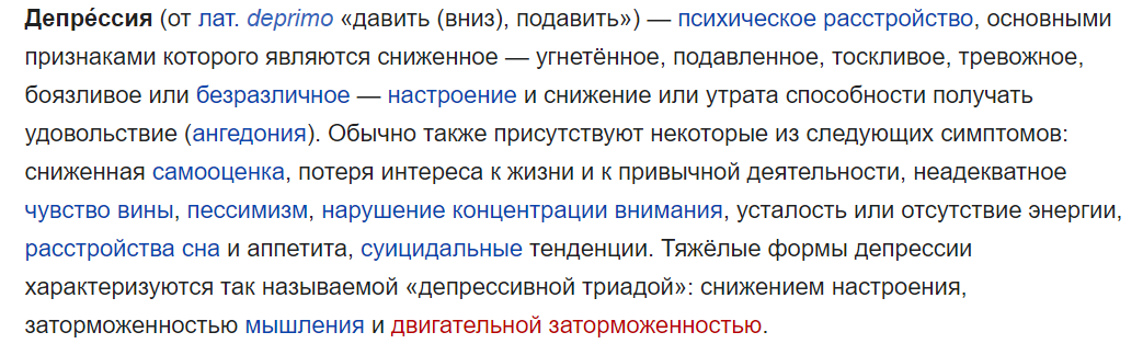 2. Ангедония — неспособность (снижение способности) получать удовольствие. От еды, секса, спорта, повседневных дел, работы, музыки, творчества и так далее.