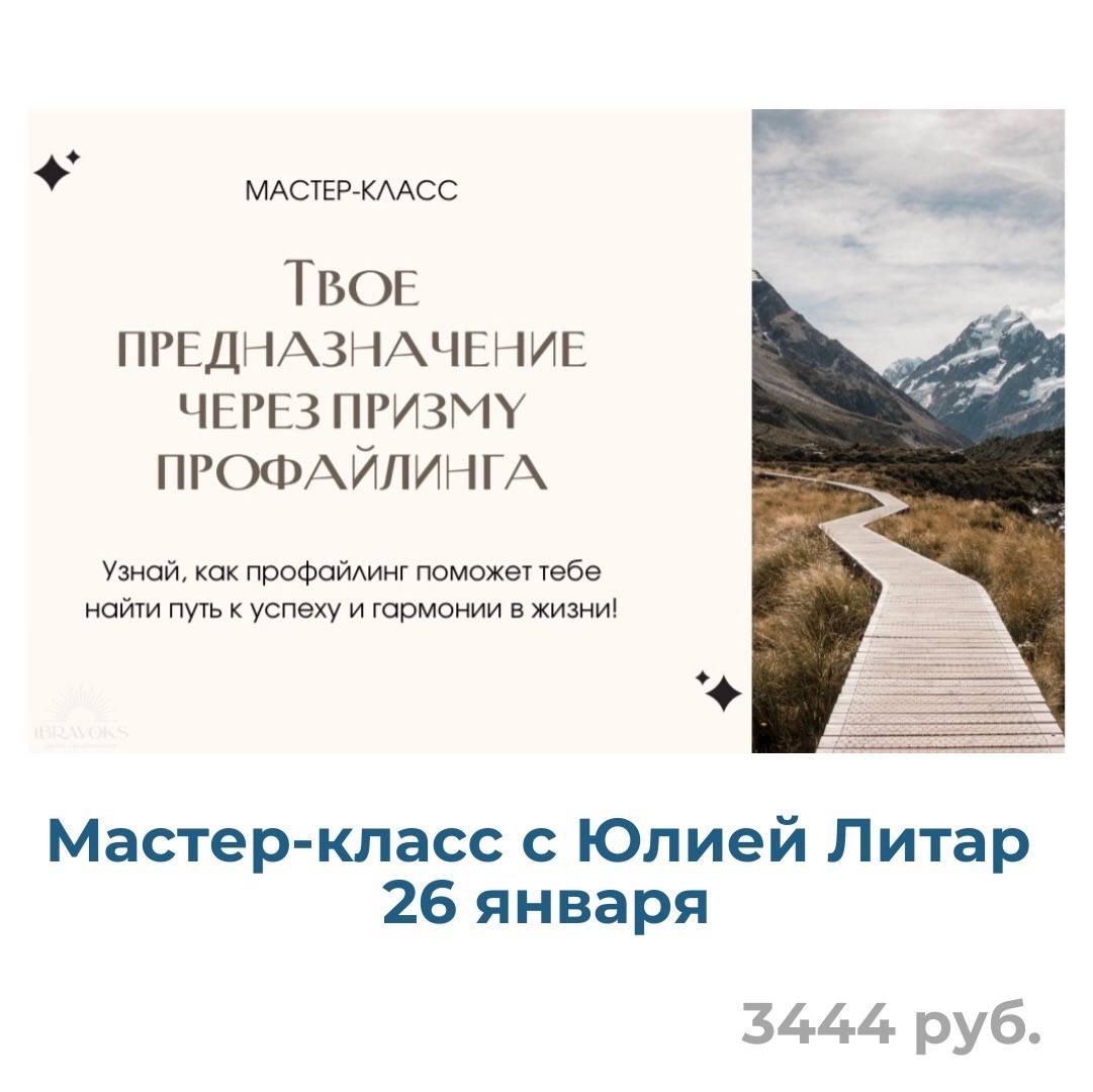 🔝 Мастер-класс проводит Юлия Литар, профайлер, эксперт в сфере психологии поведения. ☑️ 26 января (воскресенье) ☑️ 3444 руб. вместо 6444 руб. (Только 3 дня) В результате прохождения мастер-класса вы: ✅ Выясните с помощью профайлинга свои сильные стороны. Узнайте, в чем выдействительно талантливы! ✅ Определите глубинные ценности. Поймете, что движет вами и как это влияет на ваши решения. ✅ Найдете свое предназначение. Построите план, который приведет вас к желаемой жизни и карьере. ПРОГРАММА МАСТЕР-КЛАССА: 1. Введение Что такое предназначение, что такое профайлинг и как он помогает в определении своего предназначения. Ключевые аспекты профайлинга: личностные черты, ценности, мотивы. 2. Понимание себя через профайлинг Как ценности определяют наши цели. Определение своих сильных сторон. 3. Связь ценностей и потребностей с предназначением человека. Психотипы человека и подходы