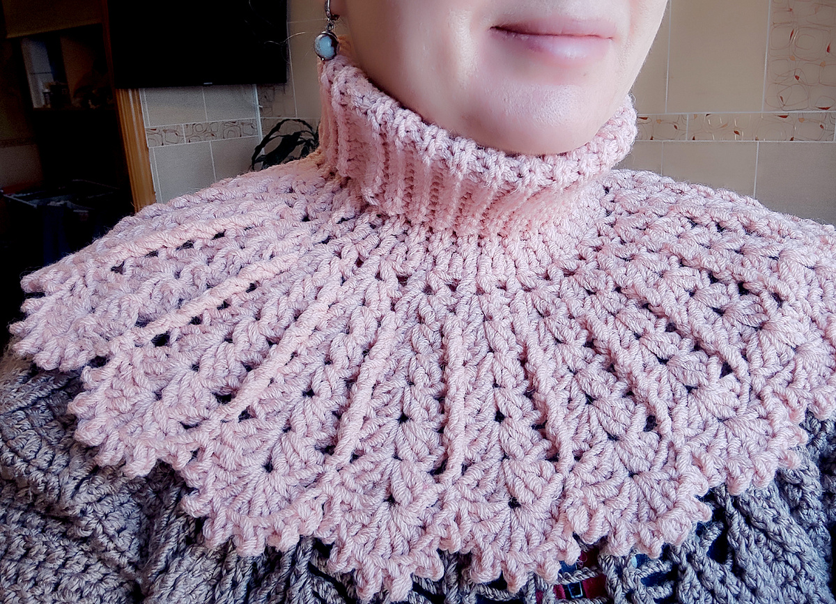 Здравствуйте, дорогие читатели! Вот, связала себе тёплую манишку и спешу поделиться! Манишка это очень удобно - я постоянно их ношу и даже вяжу на заказ. У меня есть целая подборка тёплых аксессуаров крючком и спицами. Вязала эту красавицу из турецкой пряжи Kartopu Elite Wool, 100 грамм - 240 м. Состав 49 % шерсть, 51% акрил. Крючок N5. Вязание я начала с горловины. Для этого набрала цепочку из воздушных петель длиною 20 см и вязала столбиками без накида за заднюю стенку. Сшила в трубу. Я более подробно рассказывала о вязании горловины манишки здесь: Самая популярная манишка в моем магазине на Ярмарке мастеров. Описание работы + схема Затем по краю трубы связала ряд столбиками с накидом. Продолжила вязать ажурным узором с расширением. Узор я составила сама, ниже приложу схему. На всю манишку ушло чуть больше мотка пряжи. Вот, пожалуйста, схема узора, нарисованная от руки) Раппорт узора 3 петли. Связала манишку за вечер. Сразу же стала носить. Персиковый цвет очень хорошо оттеняет цвет