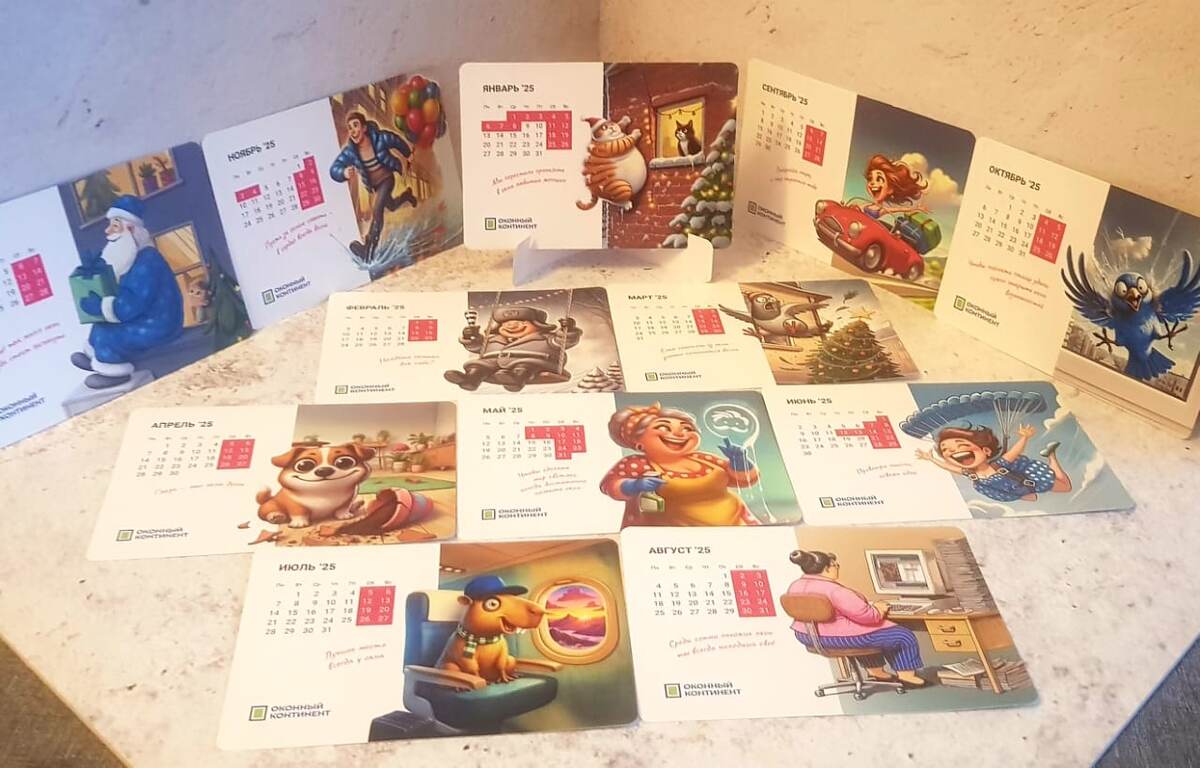 Открытки прелестные: на одной стороне численник месяца, рисунок и забавный текстик на тему окон, а на другой весь 2025 год представлен.