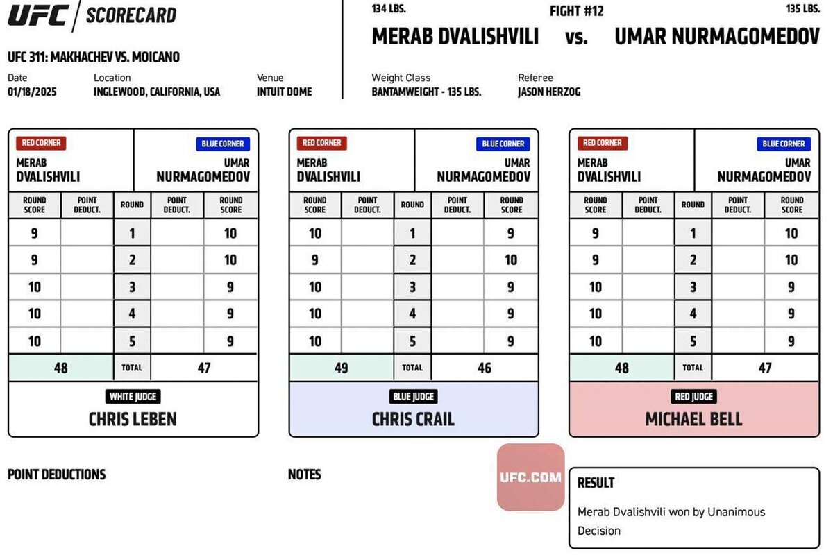 Российский боец Умар Нурмагомедов единогласным решением уступил грузину Мерабу Двалишвили в чемпионском поединке на турнире UFC 311, который прошел в Лос-Анджелесе. Бой продолжался все пять раундов.
